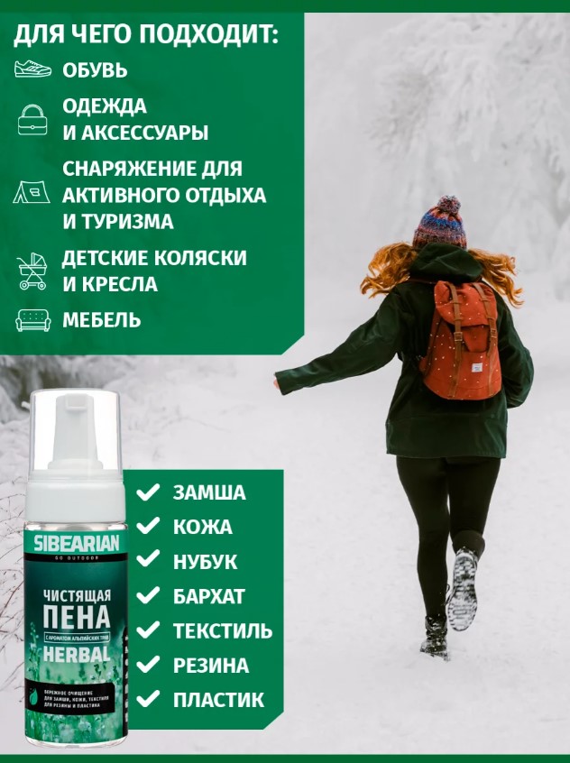 Чистящая пена SIBEARIAN HERBAL создана для глубокой и бережной чистки изделий из кожи, замши, велюра, ткани и резины. Благодаря густой и плотной текстуре, пена эффективно удаляет пятна и загрязнения даже с очень грязных поверхностей, освежая внешний вид обуви и снаряжения.